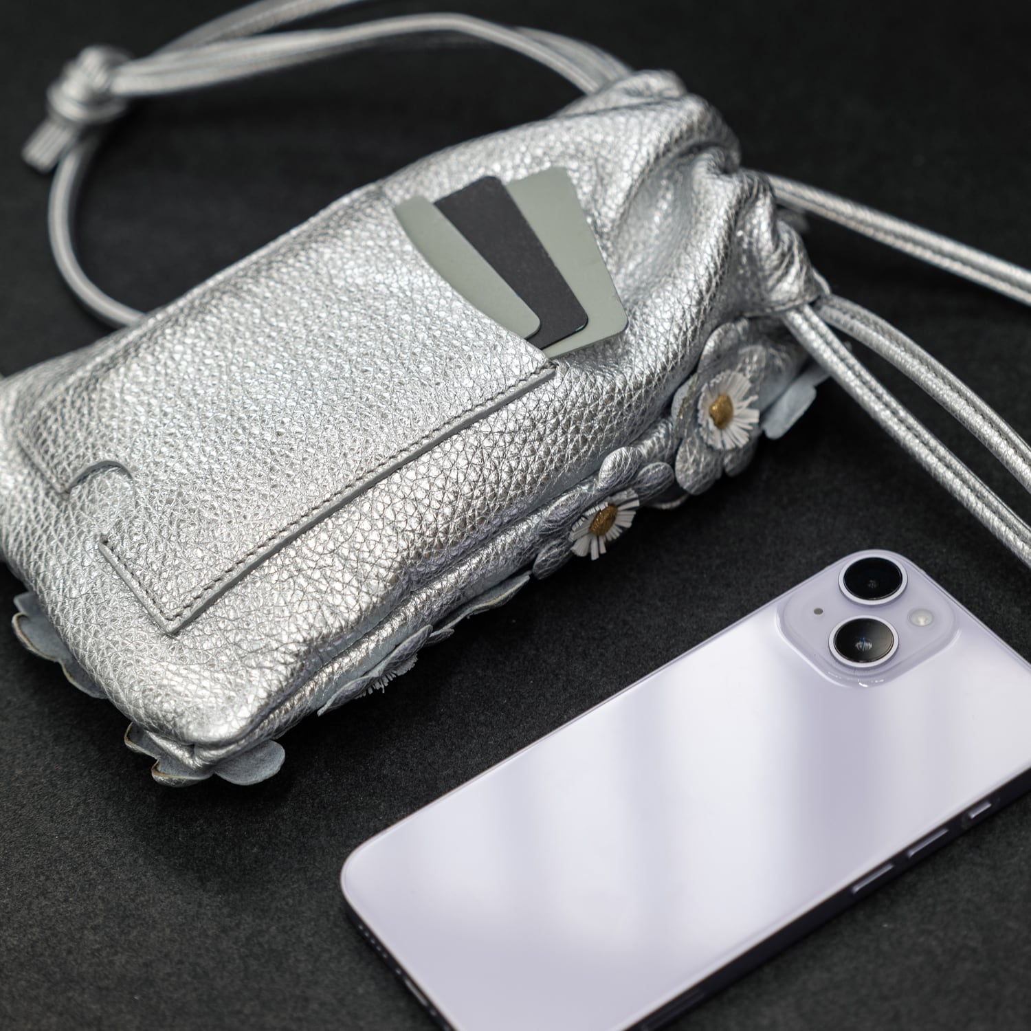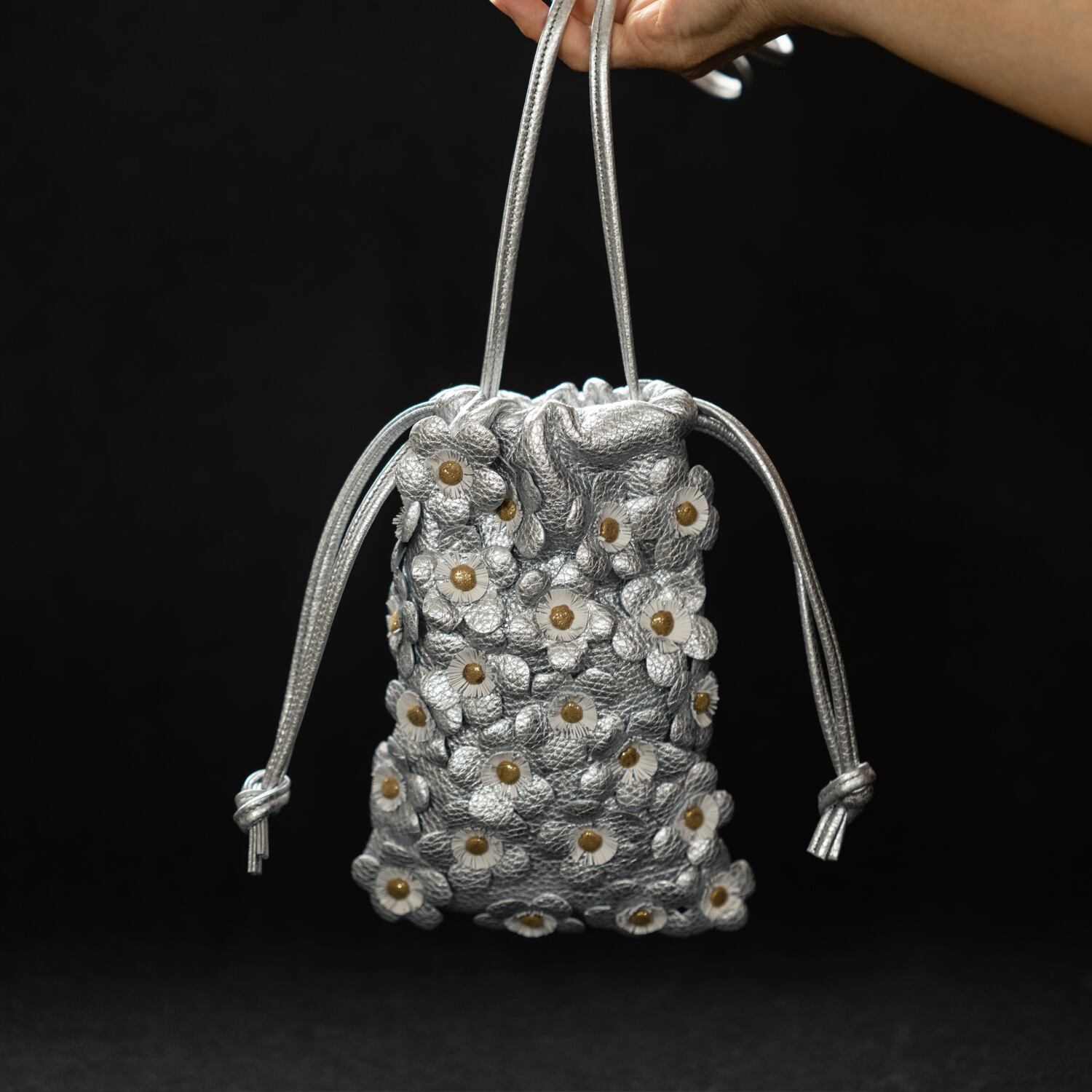 フラワー巾着バッグ イタリアレザー ミニバッグ シルバー