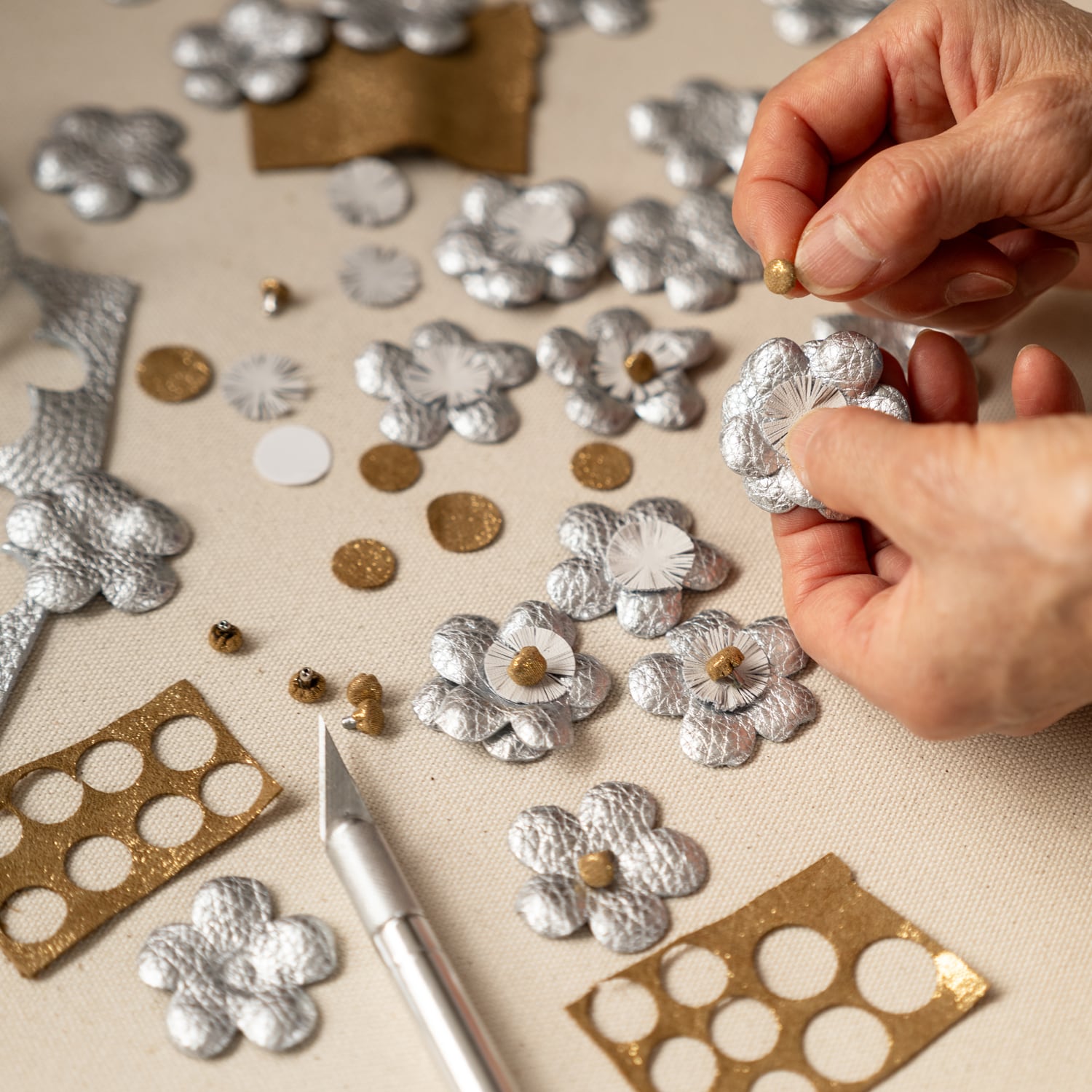 イタリア製の上質なシルバーレザーを使用し、手作業で一輪ずつお花を形作りました。