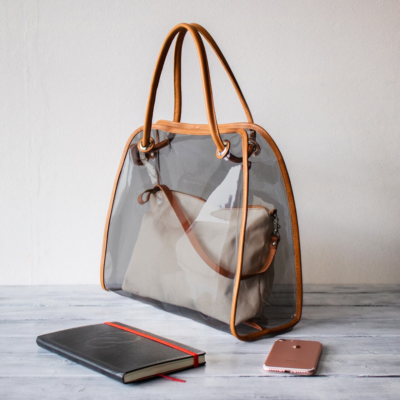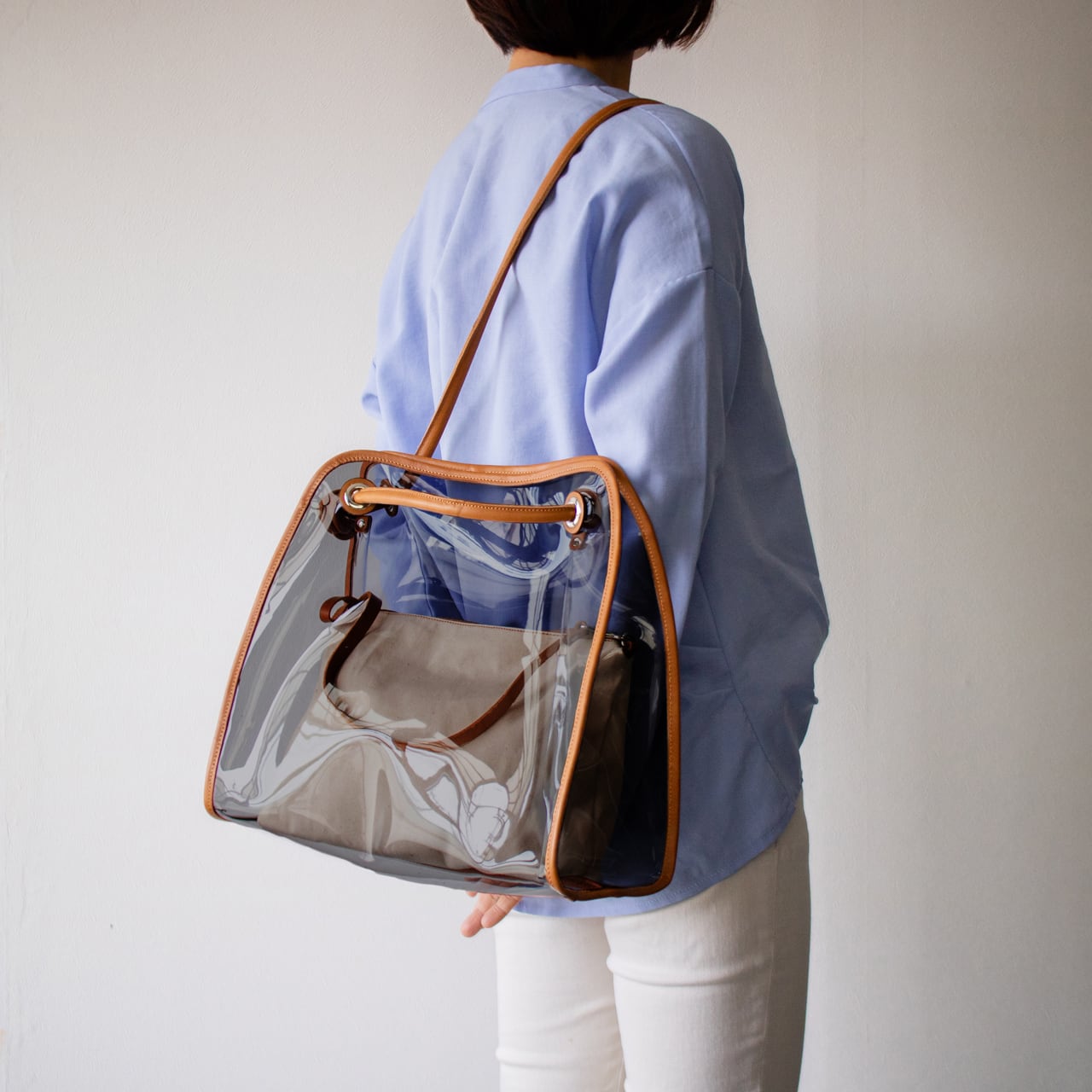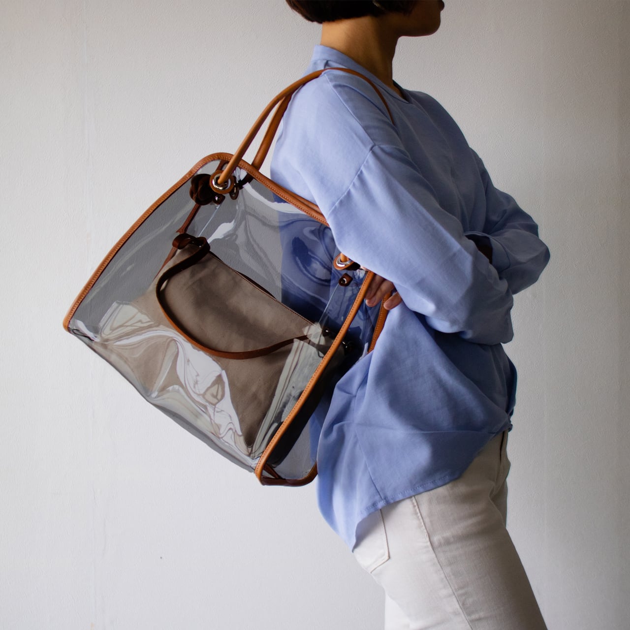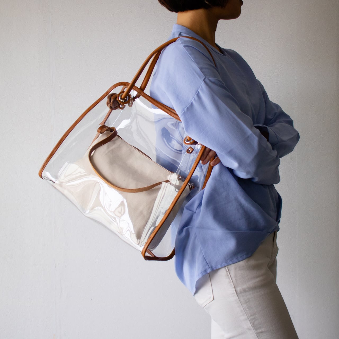 クリア 2way トート ショルダーバッグ と帆布ポーチ付き スケルトン 持ち手本革