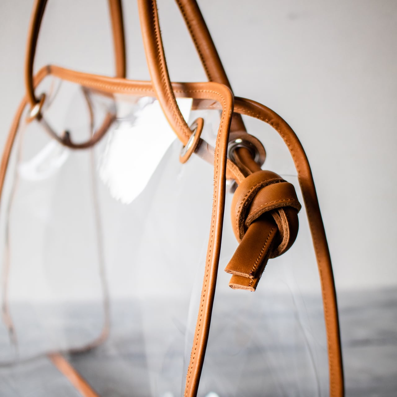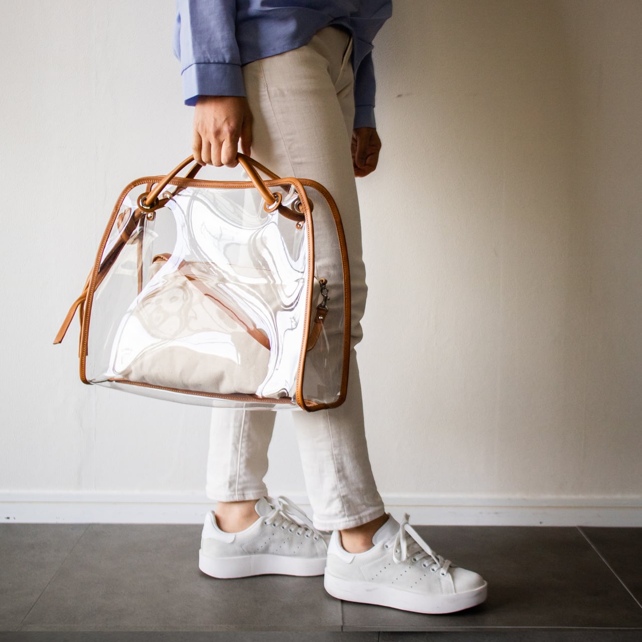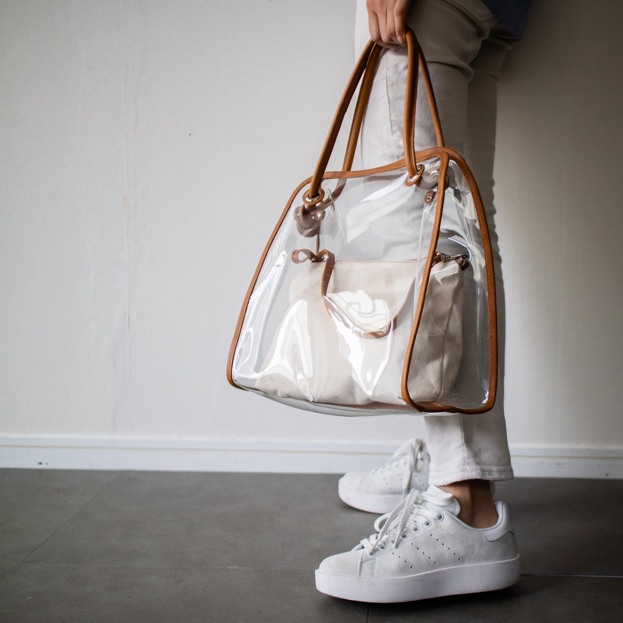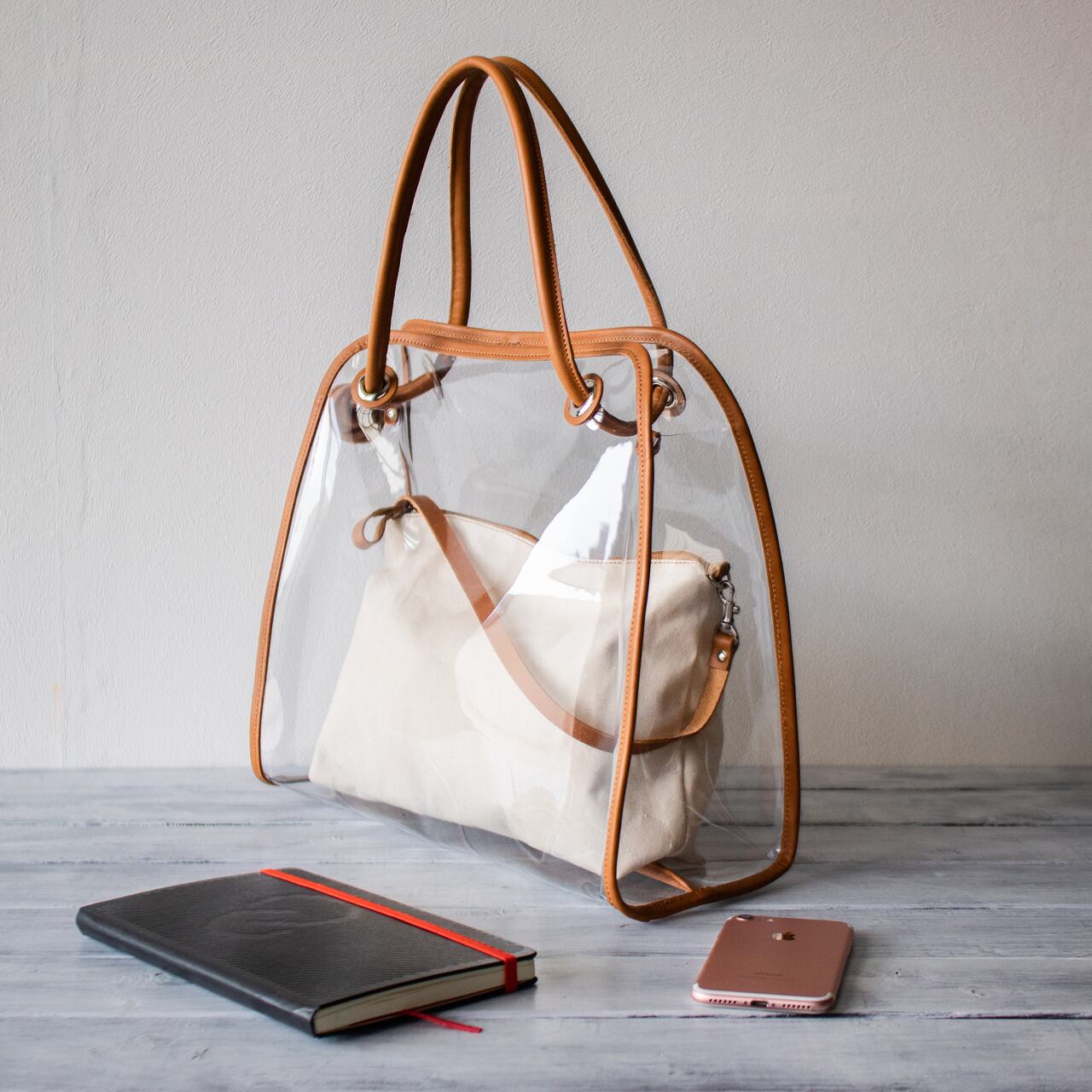 クリア 2way トート ショルダーバッグ と帆布ポーチ付き スケルトン 持ち手本革